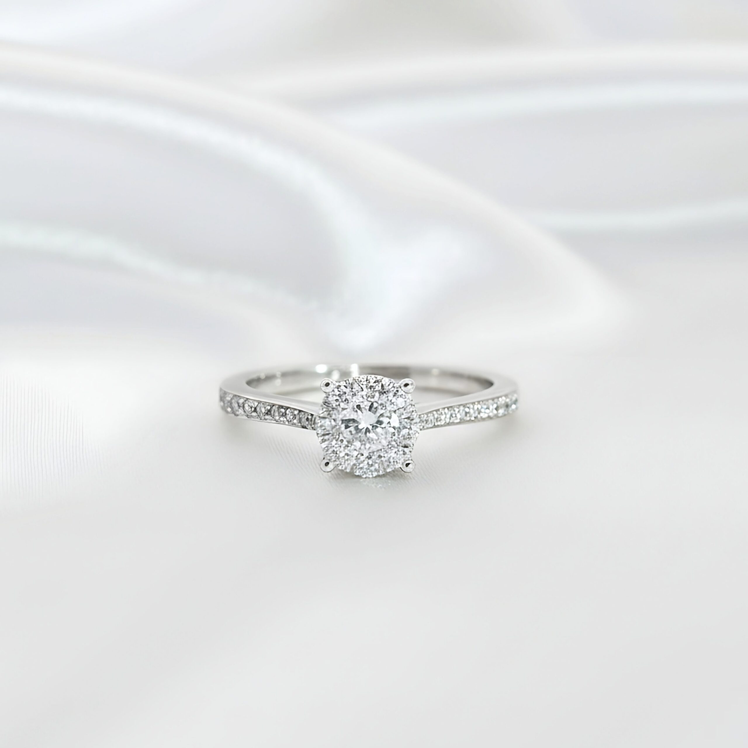 Elegant White Gold Halo diamond Ring With Sparkling Pavè Band