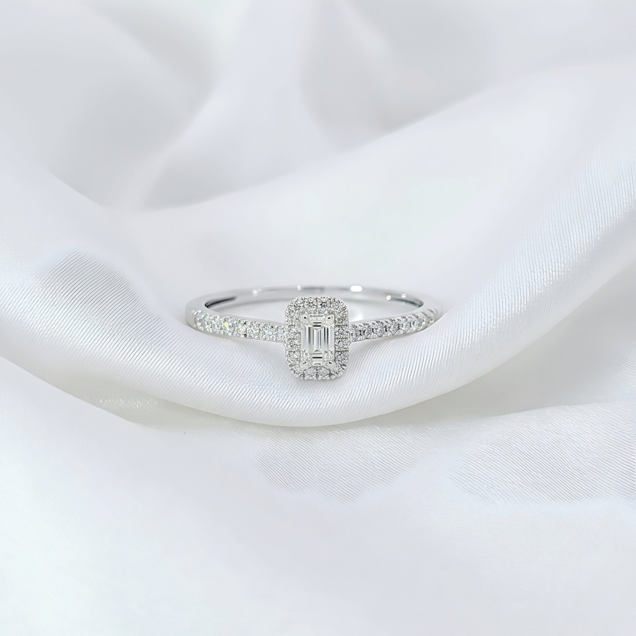 Elegant White Gold Emerald-cut Halo Diamond Ring